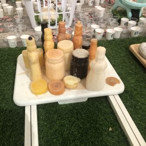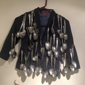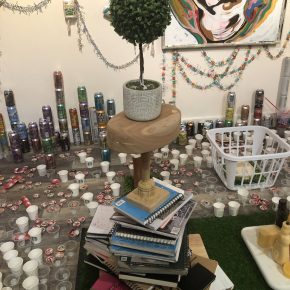 During a recent spell as a visiting artist at the Bountiful Davis Art Center, Bea Hurd took advantage of the studio space provided by the center to accumulate artifacts of these three layers, and of what she terms “the push and pull of creativity maintenance under the demands of consumerism, materialism, and capitalism.” We need to note that this is not the subject of any sort of tract, screed, or study. She has arranged the evidence into an engaging, creative display that, like any work of visual art, is meant to be apprehended by the eyes alone. Given a few hints to start with, primarily a poem scrawled on the wall and the customary brief artist’s statement, the rest is pure aesthetics.