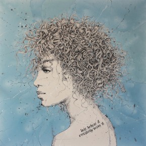 While his work may be a bit reminiscent of pop art in its graphic quality, bold color, and, in some ways, appropriation of the cultural norm of beauty, his style is his own. Another part of his 30,000 hours of practice has been invested in process: how to make oil paint flow off the end of a spoon with just the right amount of control or lack of control. He needs that chaotic, uncontrolled part of the process to unravel him from the realism and accuracy that is second nature. Yet, he needs some control to accomplish the likeness that he wants to capture in a portrait and the beauty that goes with it.
